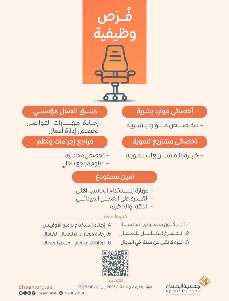 تعلن جمعية الإحسان للخدمات الاجتماعية عن توفر فرص وظيفية شاغرة للانضمام إلى فريق عملها والمساهمة في تحقيق رسالتها.