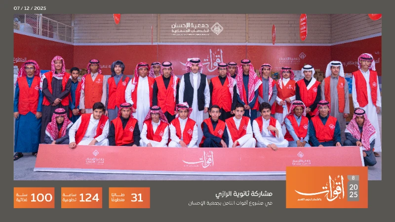 شاركت ثانوية الرازي في يوم الطالب التطوعي ضمن مشروع "أقوات 8" الذي تنظمه جمعية الإحسان للخدمات الاجتماعية بالشراكة مع إدارة التعليم بمنطقة القصيم.