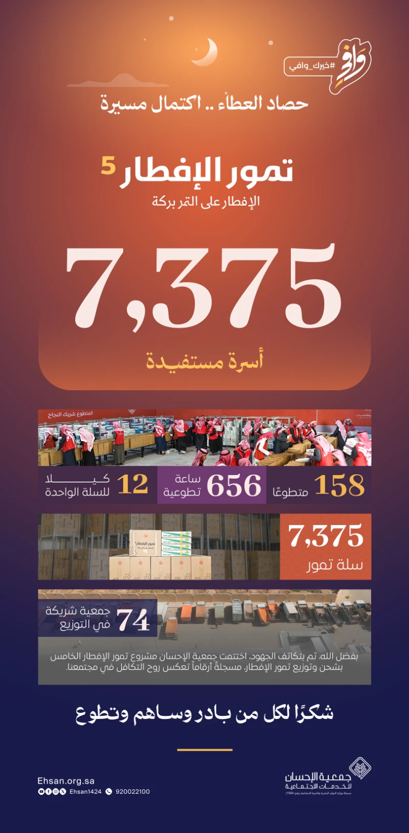 بفضل الله تعالى ثم بدعم أهل الخير والعطاء، أعلنت جمعية الإحسان عن اكتمال مسيرة العطاء في مشروع "تمور الإفطار 5"، الذي جاء امتدادًا للجهود الموسمية في خدمة الأسر المستفيدة وتعزيز التكافل الاجتماعي خلال شهر رمضان المبارك.