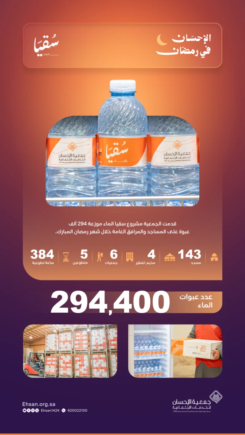 وزعت الجمعية 294,400 عبوة ضمن مشروع سقيا الماء خلال رمضان 1447هـ